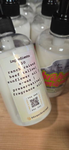 Quench your skin with ranch raised beef tallow and sunflower oil. Tallow lotion is a lightweight, non greasy lotion that soaks in quickly so you can get back to work without waiting!