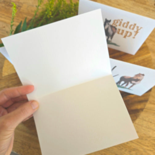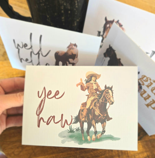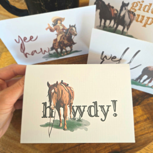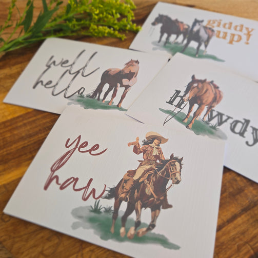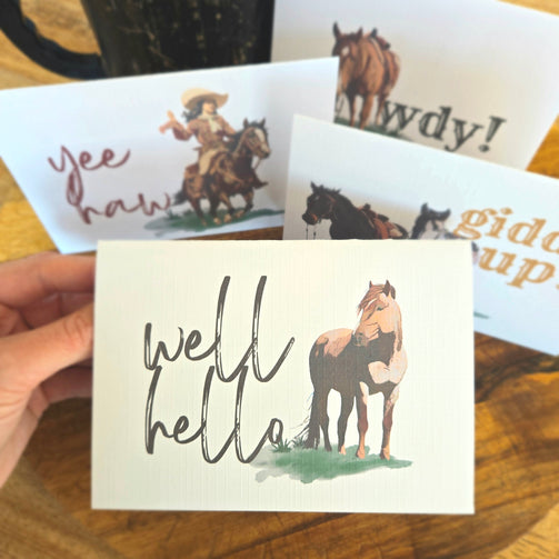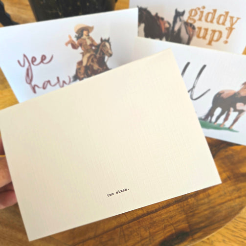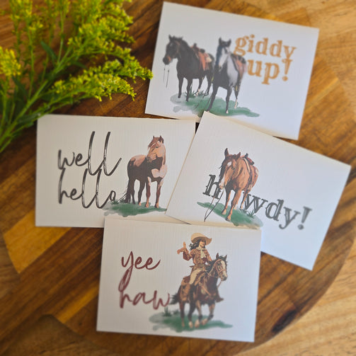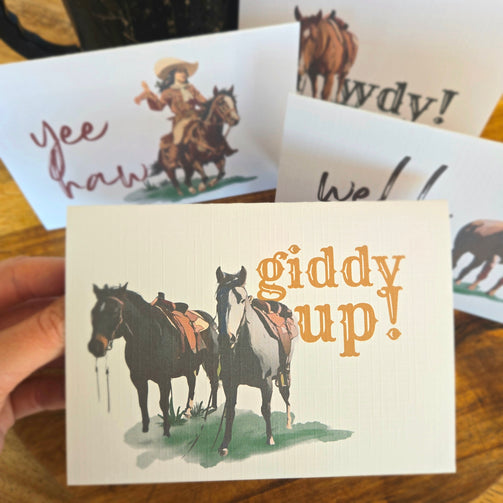 Send a little hello in the mail with these blank greeting cards. The cowboys if the ranch will be sure to put a smile on your face.